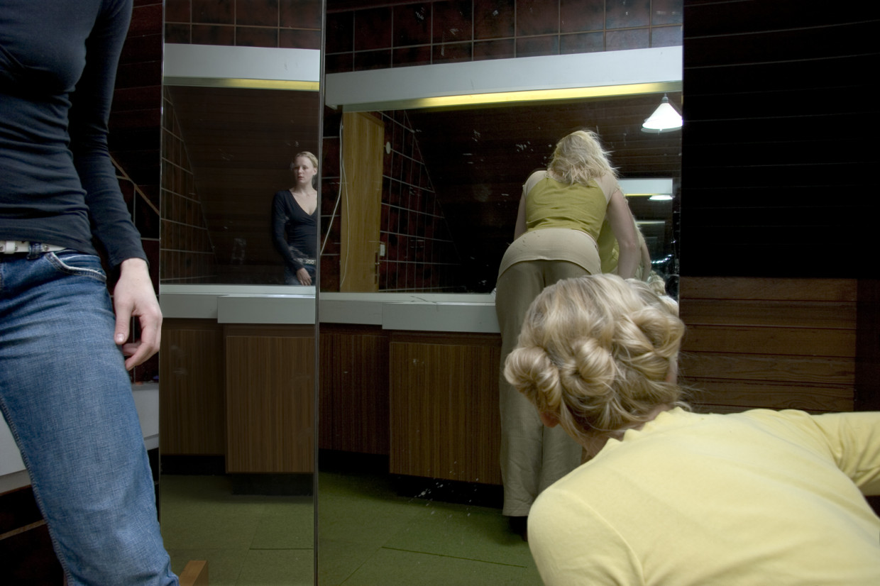 Die junge Bremer Fotografien Cosima Hanebeck hat dieses Genre nun um eine ganz eigene Position erweitert. Wie bei den genannten Autoren ruft die Betrachtung im ersten Moment Verblüffung hervor. Den Sehgewohnheiten der momenthaften Fotografie folgend kann es nicht sein, dass ein und dieselbe Person mehrfach in einem Bild auftaucht. Doch die Fotografin zeigt ihr Gesicht nicht in jedem Bild und nicht in jeder Position. Ersz nach und nach wird klar, dass wir es immer wieder mit ihr zu tun haben.